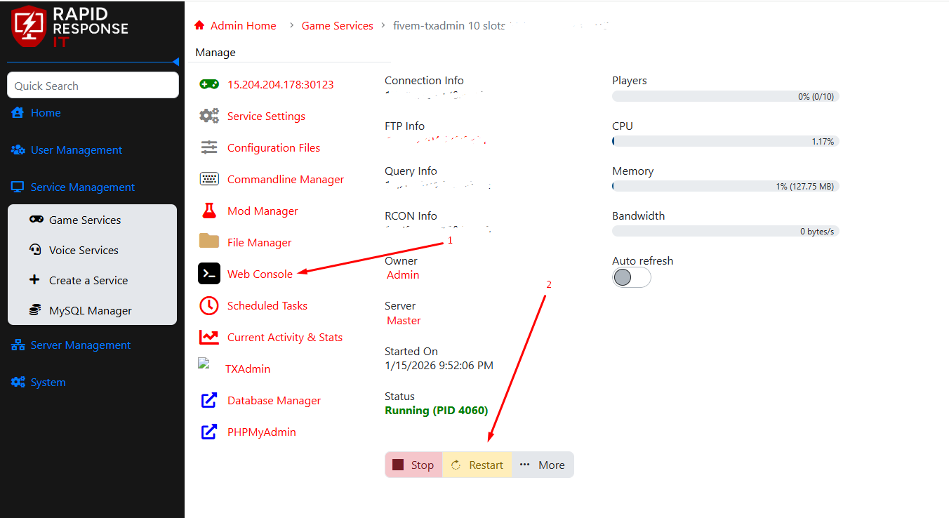 Once you have selected the service, go to the TXAdmin button (1) on the left navigation bar, right-click it and open in new window. Then Restart (2) the server.